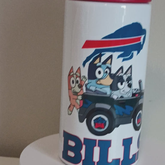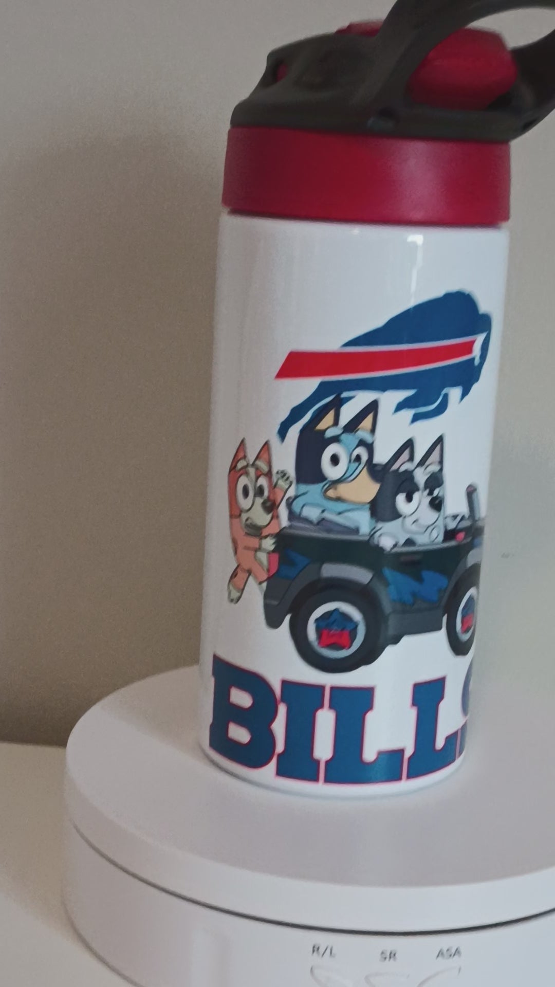 12oz stainless steel kids water bottle. Bluey Buffalo bills, so darn cute.. Our best seller. Hand wash only